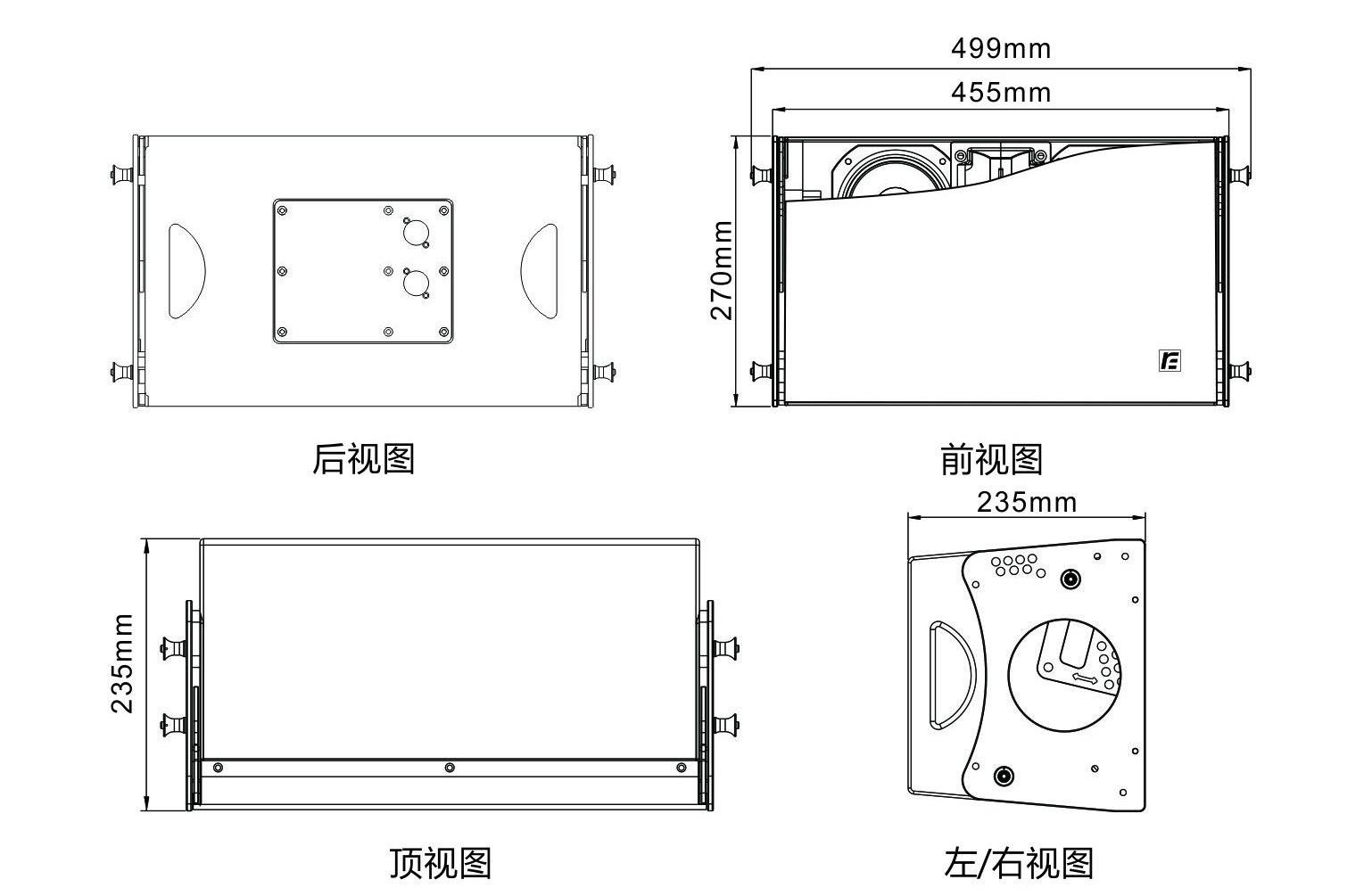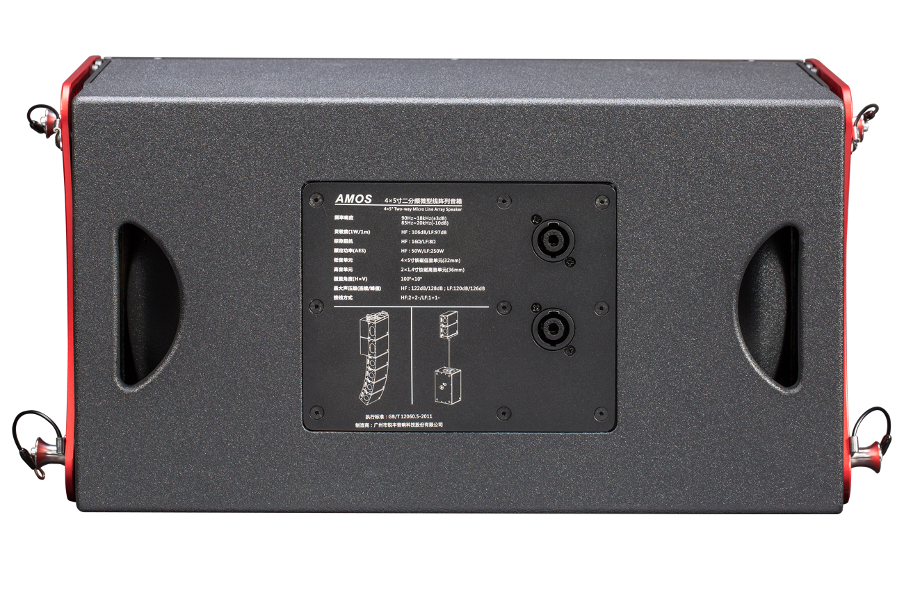采用2只1.4寸进口钕磁高音单元,搭配对称结构线性波导管号角,实现可控及精准的声学波阵面覆盖;并具有声能量高效转换特点,确保小单元大声压状态下单元的失真更低。采用4只5寸进口中低音单元,以高音为中轴水平对称式设计,中频覆盖更自然均匀;箱体两侧配置简易安装吊挂连接件及两个力学优化式抽手,能同时满足吊挂、堆叠及支撑使用需求。