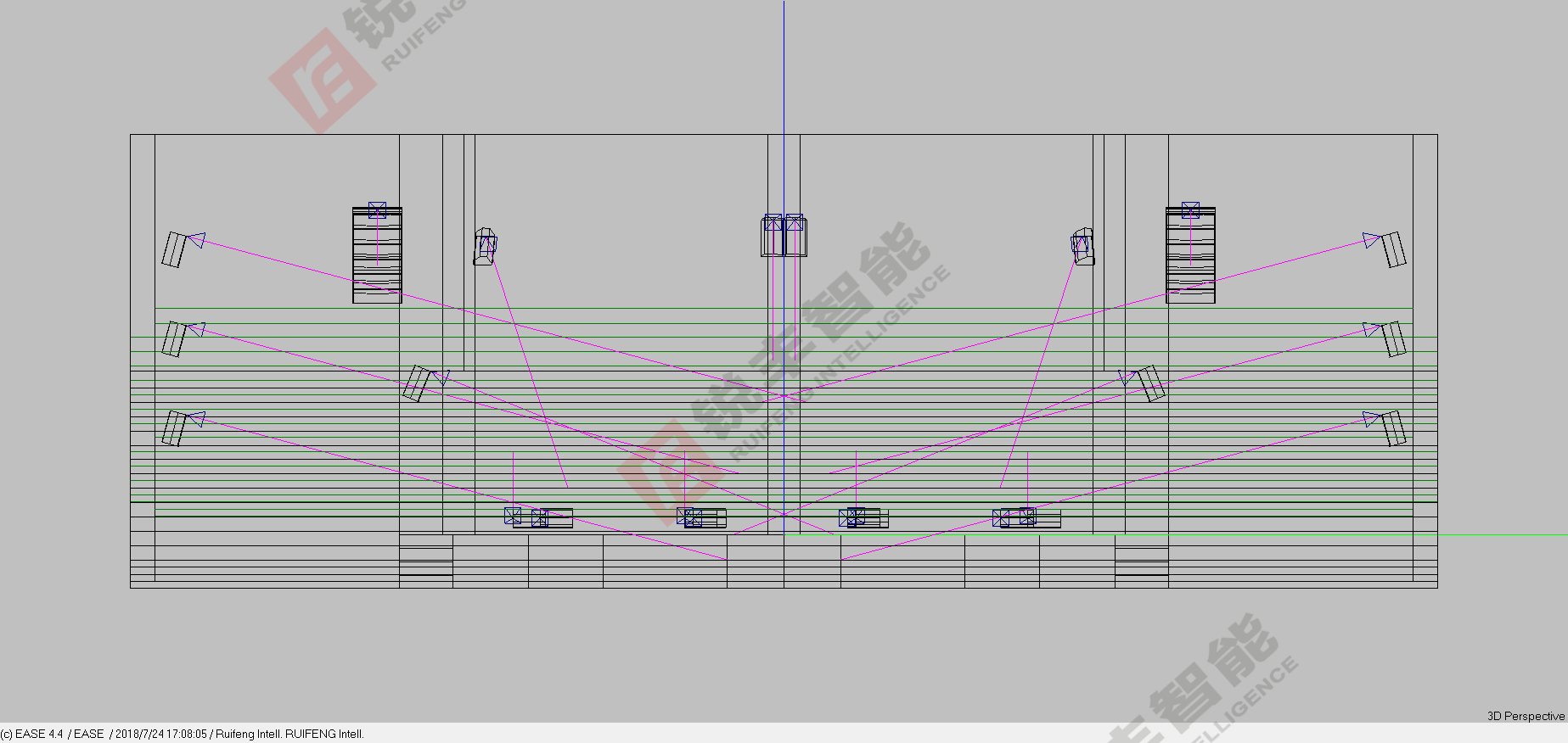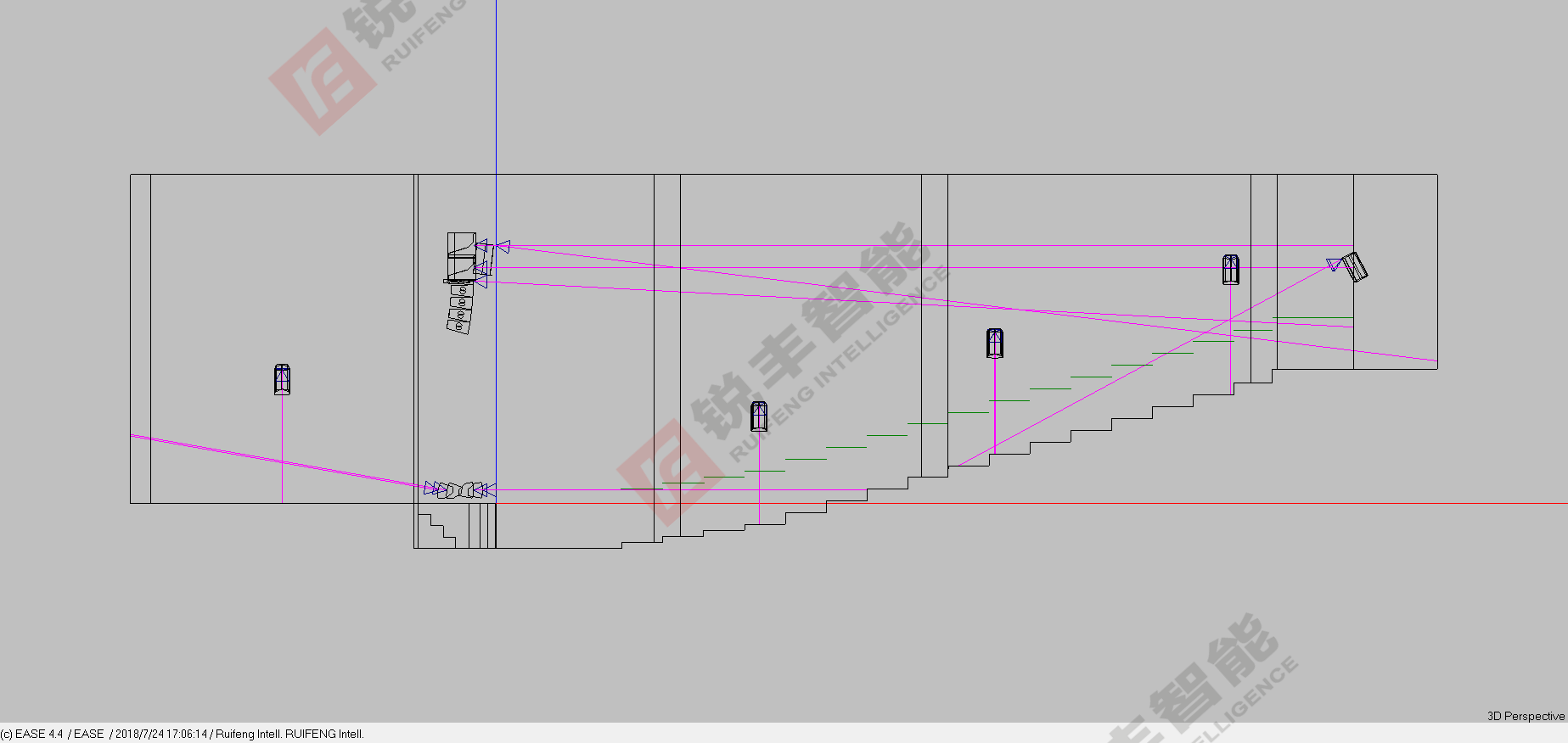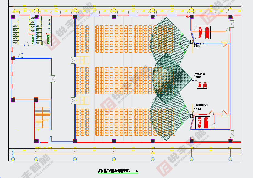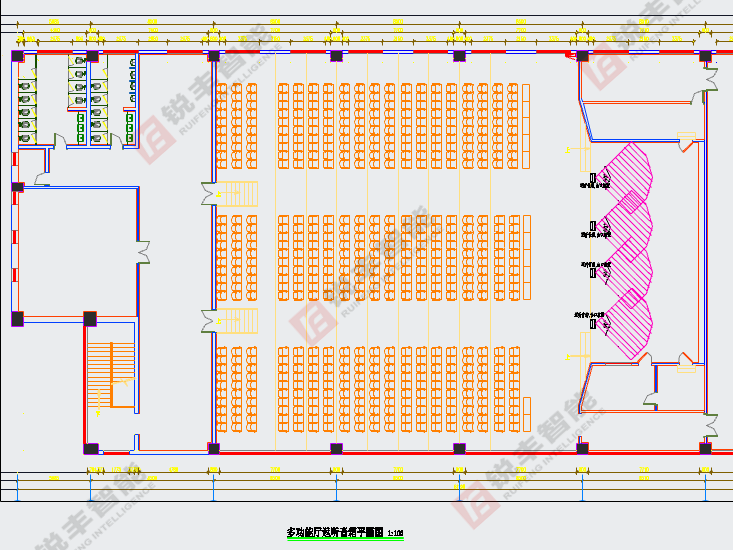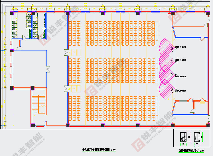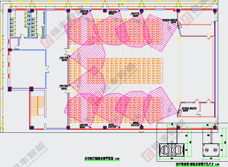 据图纸尺寸得知多功能厅的造型。系统中的所有设备均选用我司经销的技术成熟、性能先进、质量可靠的知名品牌锐丰RF系列音响,以保证设计目标的实现和系统运行的可靠性。