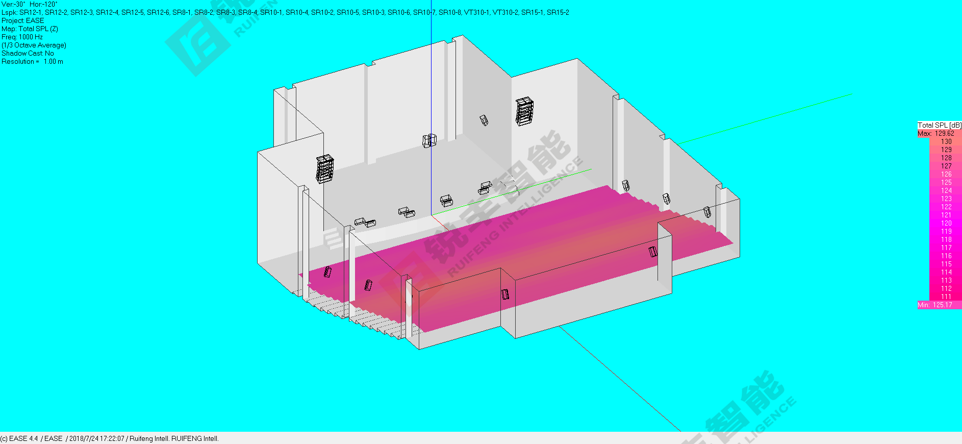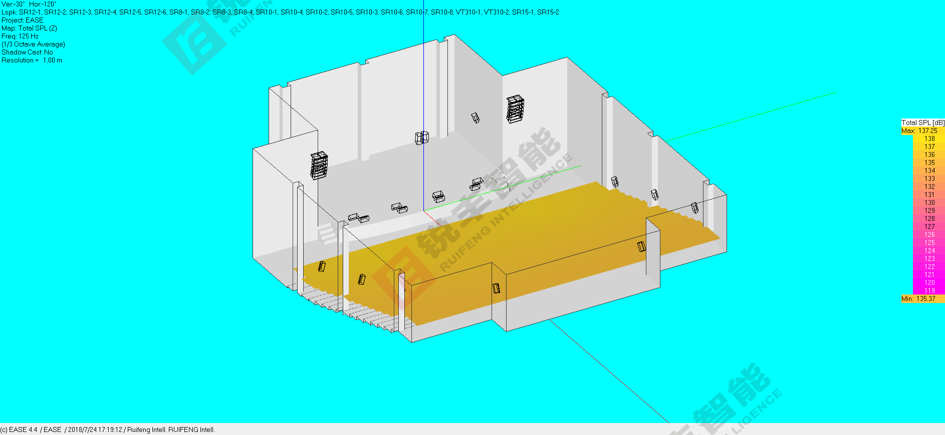 2)系统采用立体声扩声方式,必须能够完整的覆盖整个观众区。