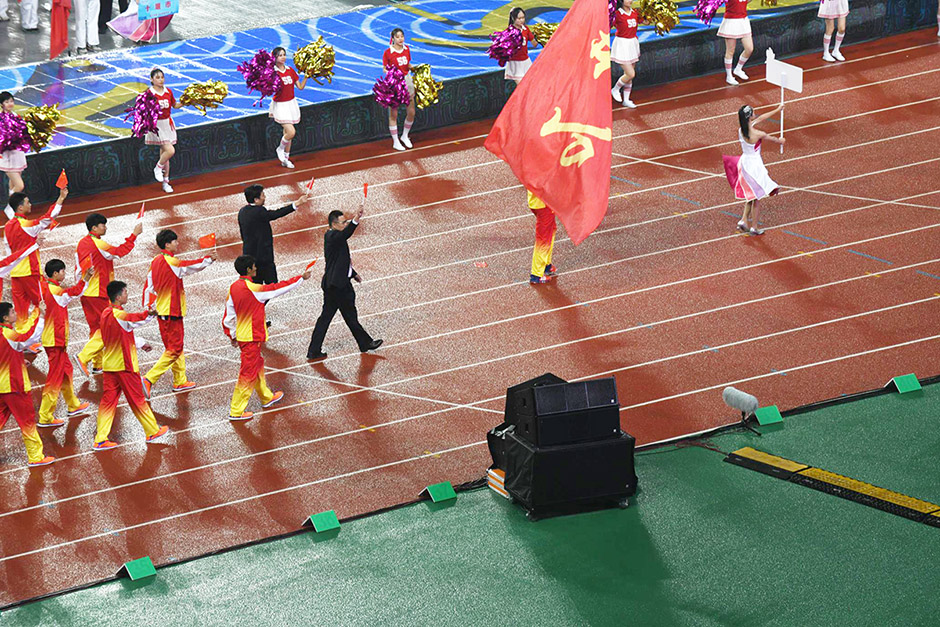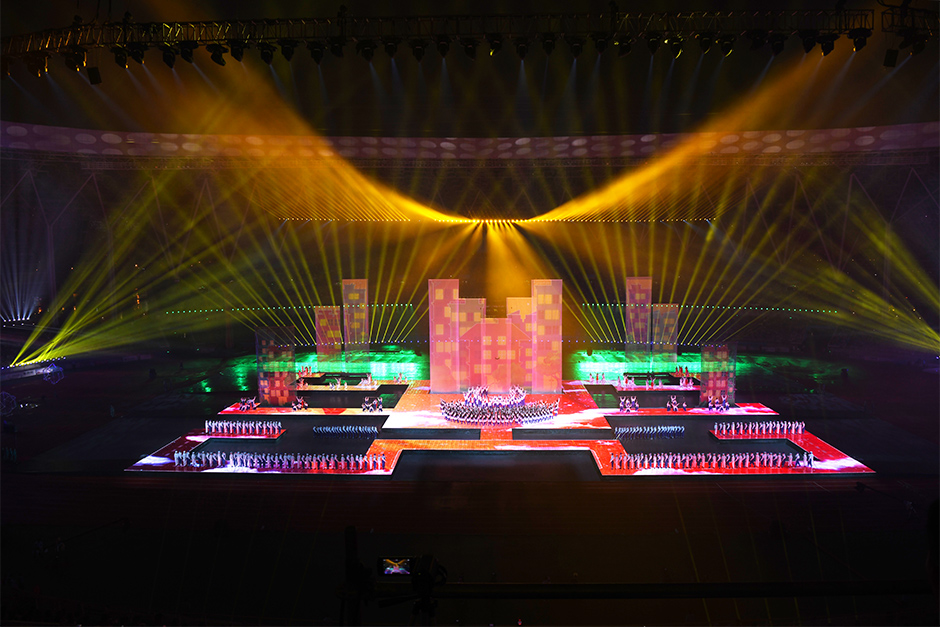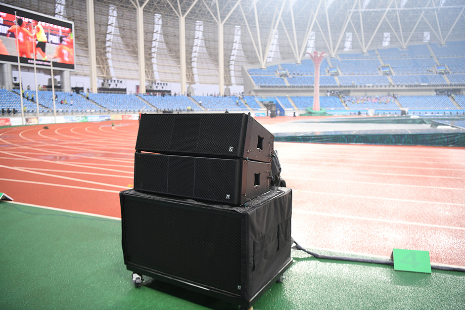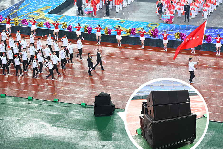 锐丰智能"RF"VT三分频线阵列系统扬声器作为开幕式的主扩声,在现场进行堆叠摆放,360度看台围跑道一圈堆放成8组。VT线阵列指向性强劲,能将声音更好地集中在观众的区域,使得声音均匀覆盖,稳定清晰。在满足现场声压级的同时,做到极高的明亮的音色。