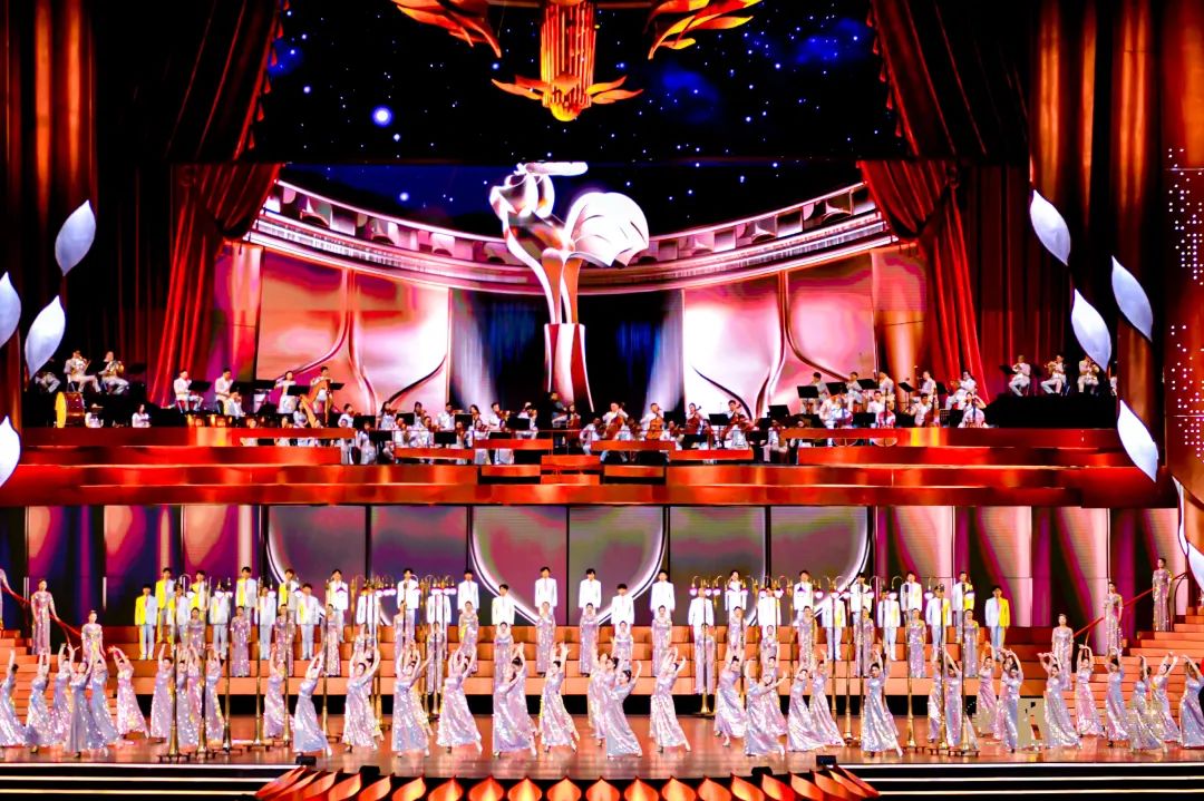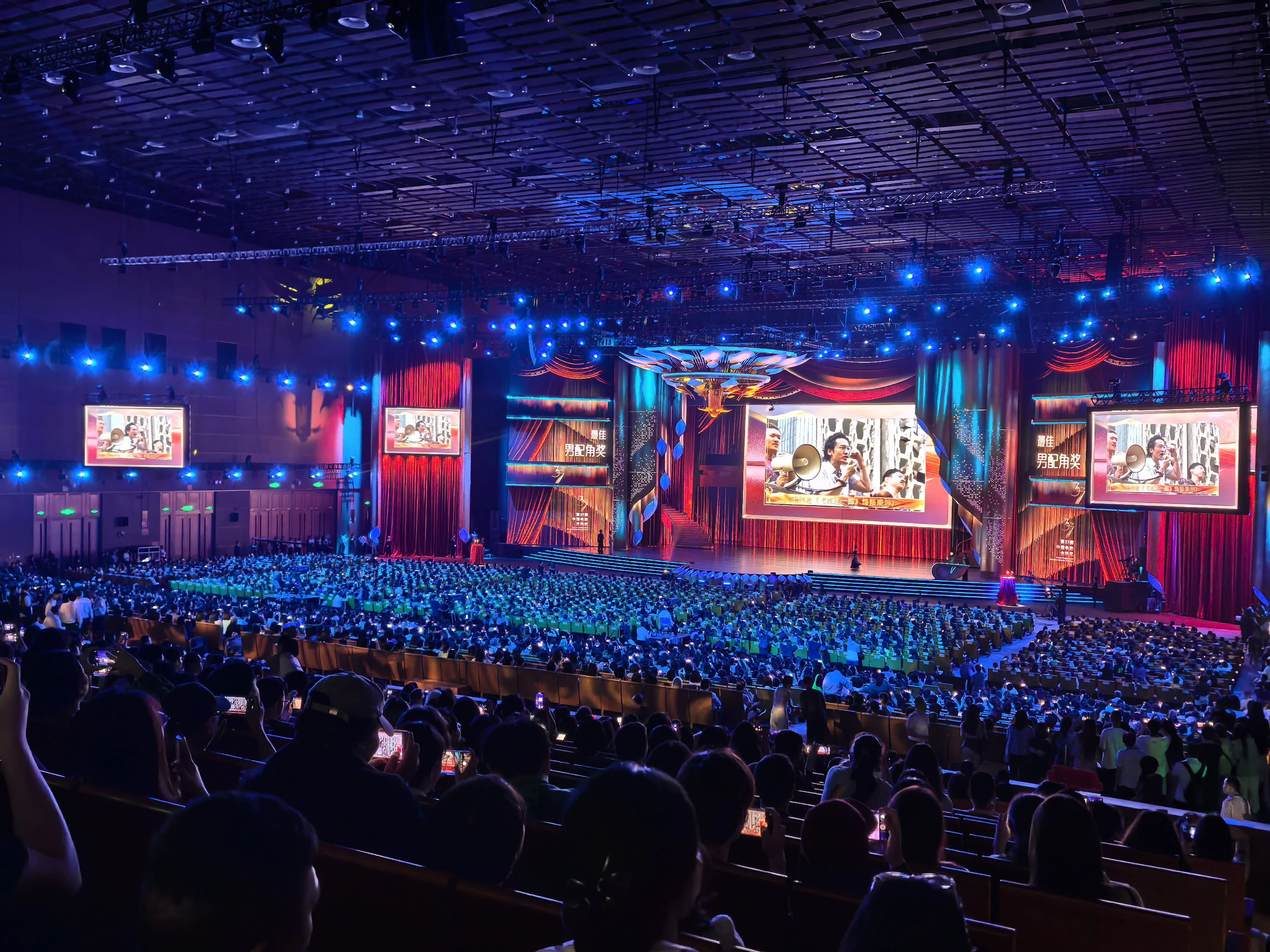 颁奖典礼主演出场地呈长方形,电影节现场观众席深约为100m,宽约70m,观众席后区有二层眺台深约20m,地面到顶部装饰面高约30m。舞台口宽约50m,设计有一层舞台演员表演区域和二层舞台交响乐团演奏区域。演出活动中扩声系统输出的声音还原度极高,语言清晰稳定,均能滿足观众席的一层和二层体验到震撼澎湃的扩声效果和一致性的高质量音效;同时,表演区演员也能够沉浸在舞台上的每一个精彩瞬间,尽情享受演出的魅力!