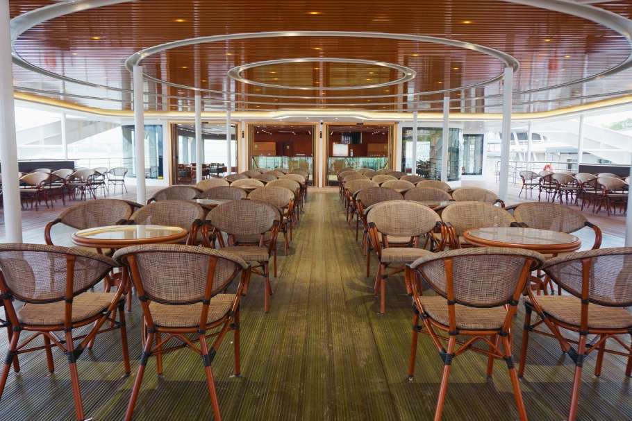 全船共有3层,首层是净空5.4m的无柱豪华大厅、包厢及厨房,二、三层为观光甲板,能满足会议、活动、餐饮等大型水上活动需求。