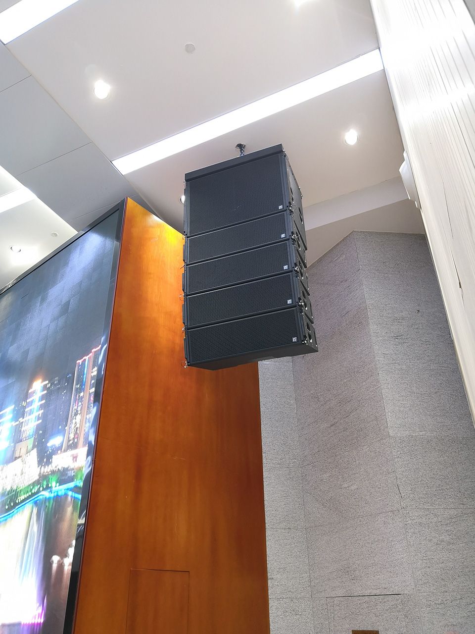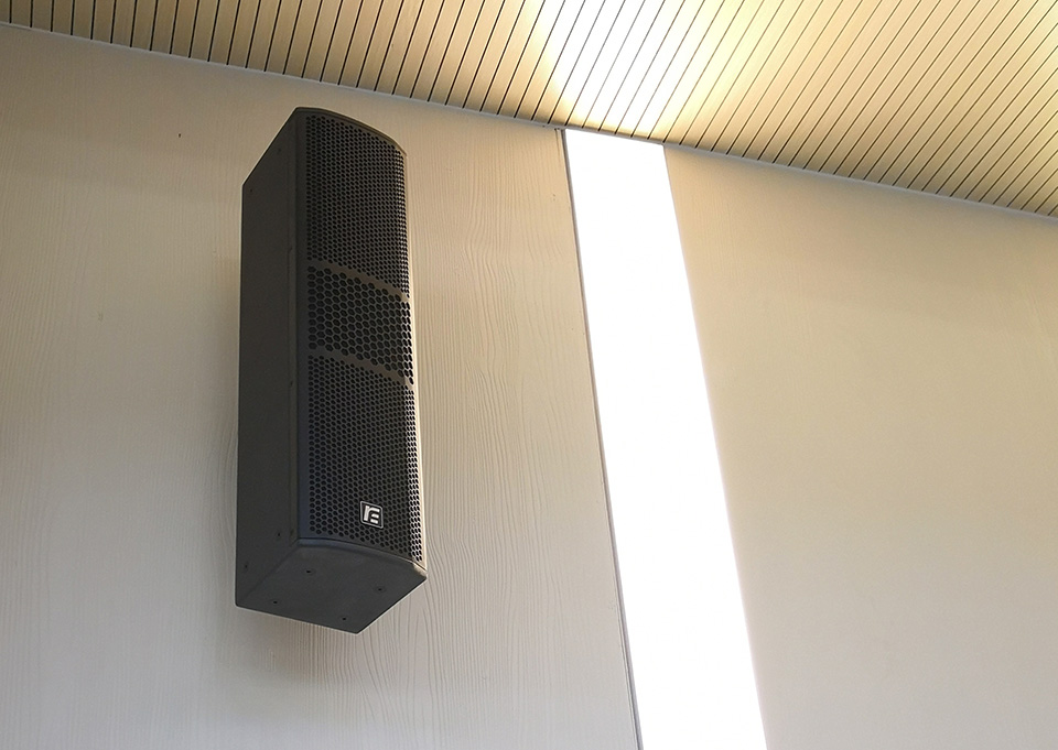我们采用了"RF"VK310+VK310S(4+1组合)双10寸线阵列音箱作为左右声道的主扩声音箱,在满足听众区有足够高声压级和均匀度的同时,强指向覆盖能有效避免了室内强反射的情况出现,达到较高的语言清晰度。