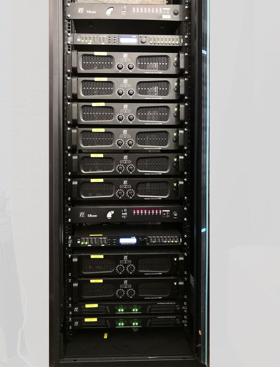 另外,配置了8只L5音柱音箱做为观众区后场补声音箱,2只SR8全频音箱做为台唇补声,进一步提升观众区扩声均匀度。舞台返听音箱采用了4只SR12 12寸全频音箱,流动分布在舞台地面摆放,具有非常好的流动性,可以随舞台的变化快速更改位置以满足舞台区声音均匀覆盖。