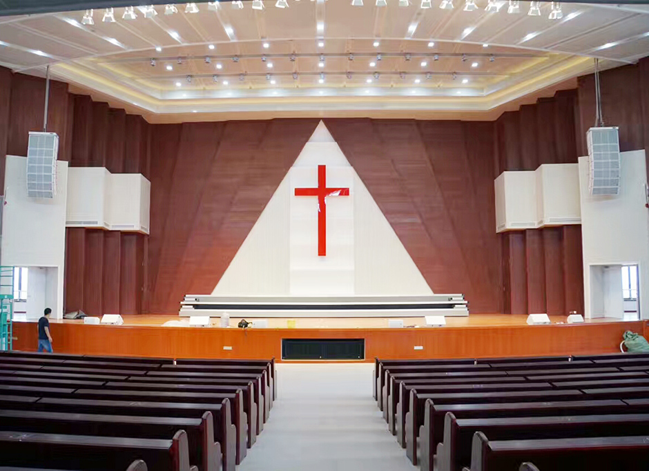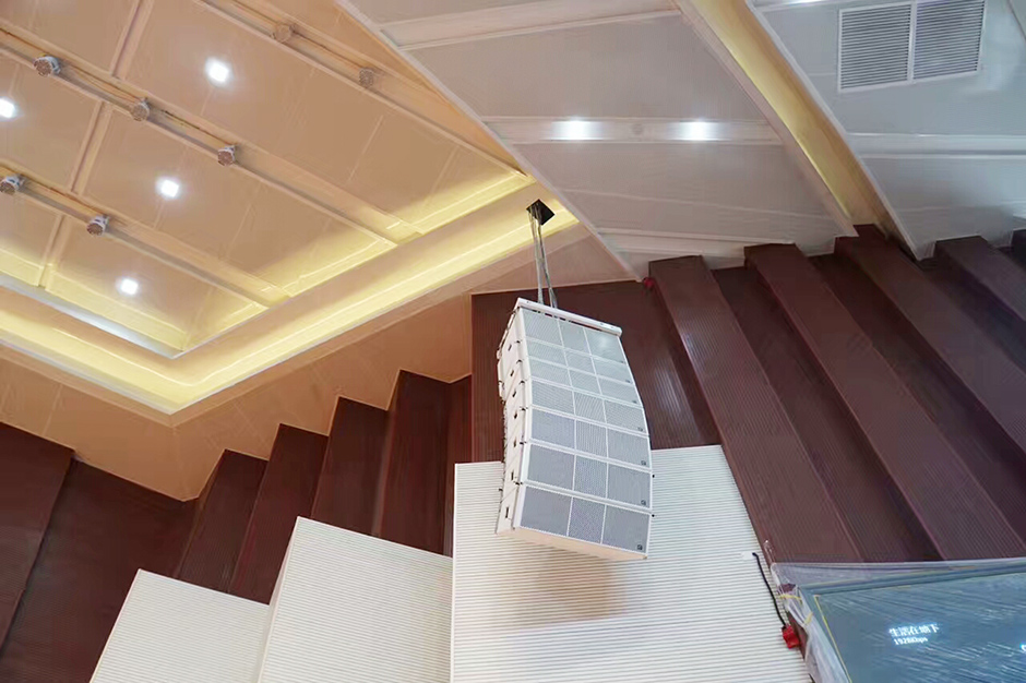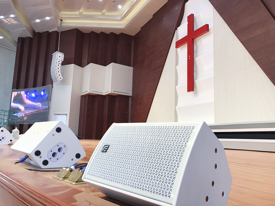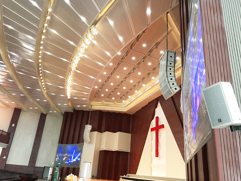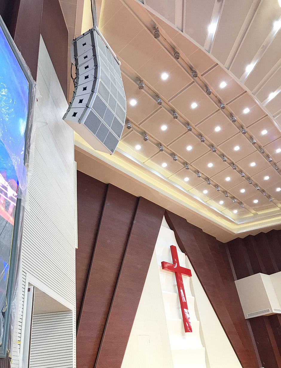 锐丰智能高端专业音响“RF”品牌为华东地区基督教堂安装了一套先进的音响系统。教堂以语言扩音为主的场所,平日需用于乐队唱诗班的演奏及合唱,有时还需用电视播映礼拜仪式,以及信徒们的文艺汇演活动。“RF”—VT线阵列音箱其卓越的语言清晰度与平滑的声场覆盖一直受到认可。教堂扩声系统选用VT线阵列扬声器作为主扩声,搭配TQ多功能系列扬声器作为辅助扩声,使用优雅的白色扬声器在美学上可以与教堂内部的布置完美地融合在一起。系统投入使用后,成为教堂领域音响系统的新标杆。