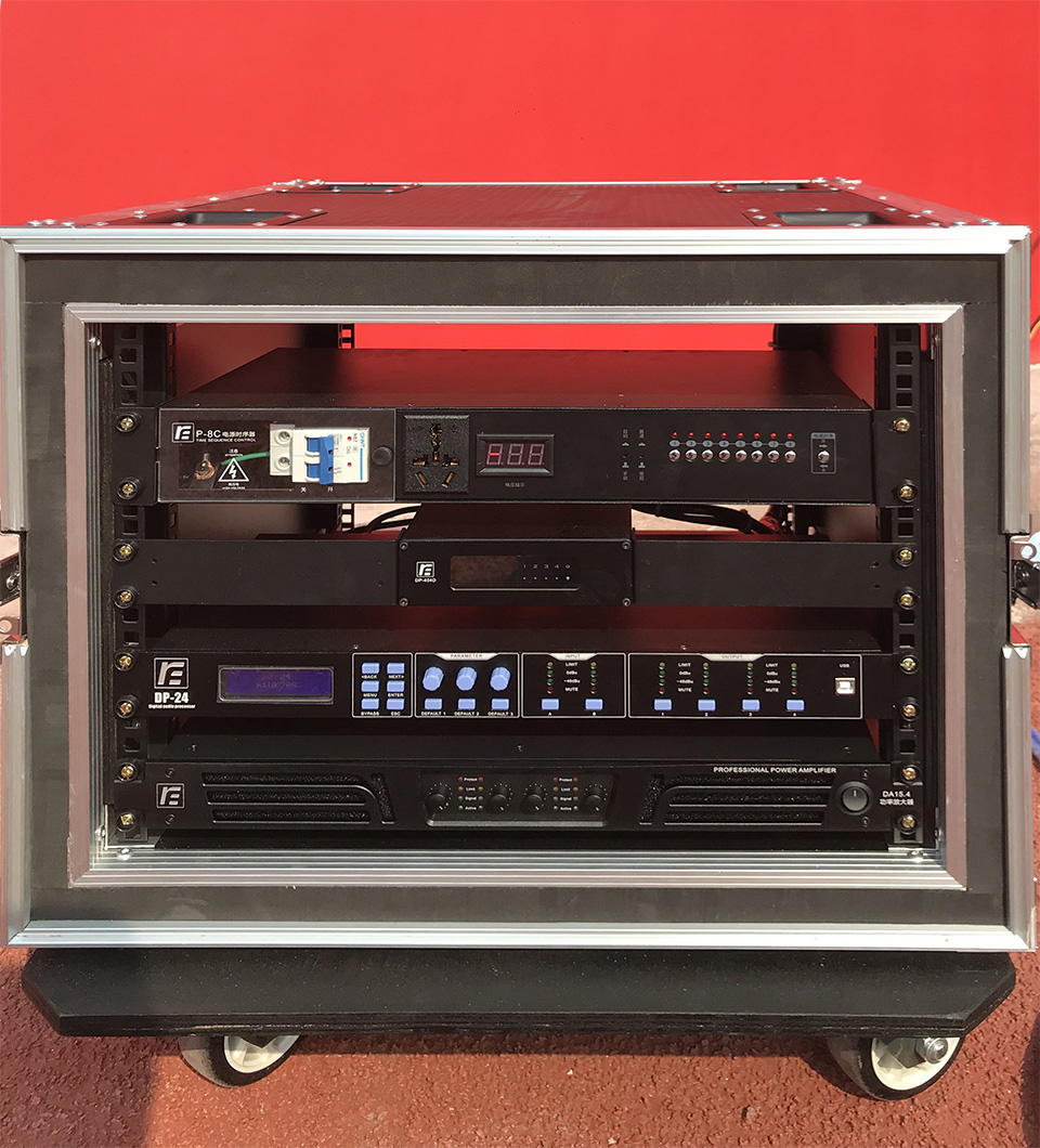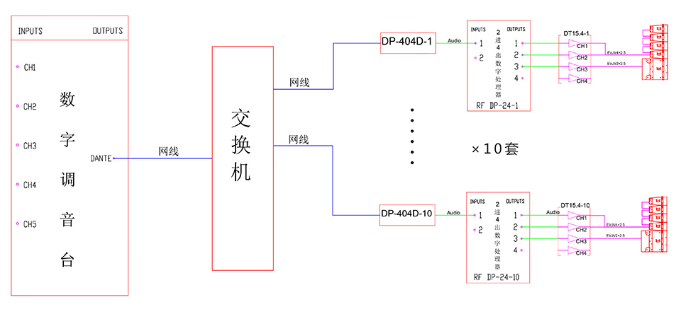 本系统是由一台带Dante功能的数字调音台,以及"RF"的10套DP-404D Dante数字音频信号接口机组成。DP-404D具有4进4出的数模转换接口,以及两个网线接口用于传输DANTE协议。10 台DP-404D均匀分布在体育场内,使场地内音频信号的采集与传输更加灵活多变,能满足各种类型的活动演出需求。