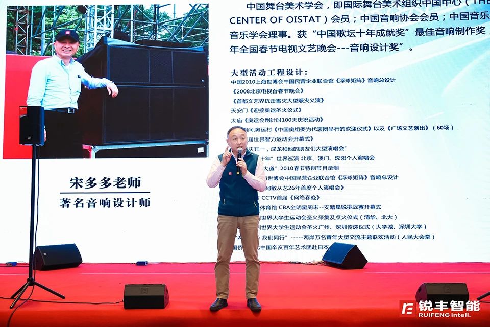 本次交流会邀请了著名音响设计师——宋多多老师为主讲嘉宾,宋老师结合"RF"音响系统,为嘉宾分享了不同扬声器针对不同场合的应用方式,结合交流会现场的声学环境,分享了提高语言清晰度的方法。并且讲述了扩声系统在演艺扩声中的实用技巧。